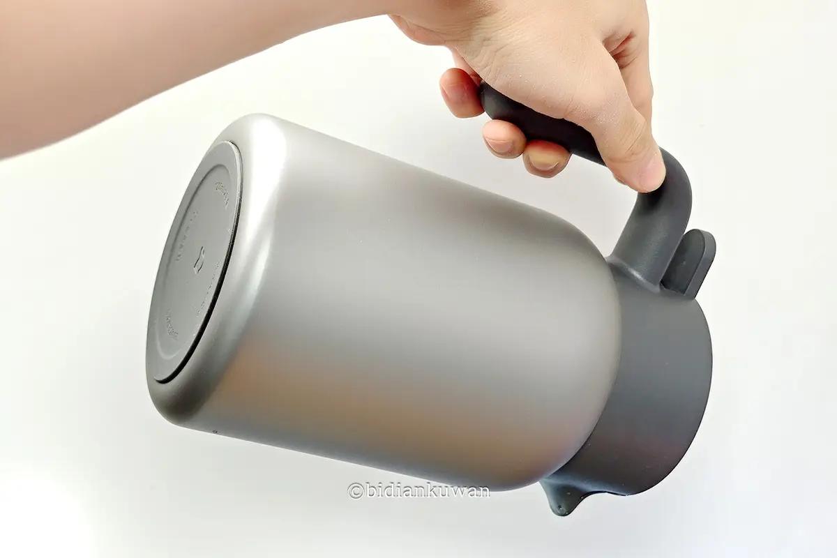 我甚至试过装着水突然横置、倒置(模拟水壶意外跌倒的状态),发现横置时不漏水、倒置时虽然壶嘴开盖但并未漏水,仅有嘴口残水几滴落下。