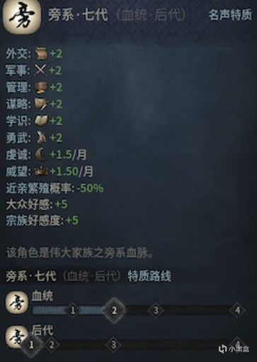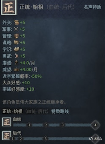 二、【後代】 家族繁衍生息,後代變得很多很多,很多人都不知道如何稱呼對方。爲此我加入了後代特質,這樣大家就能看到同族的輩分高低,就知道之間的關係如何。 ————整合新增【血統·後代】特質,將【血統】和【後代】統一放進一個特質裏。血統欄顯示此人血統的純潔性,分數越高越純潔。後代欄顯示此人是第幾代,若是一百代表是始祖。————
