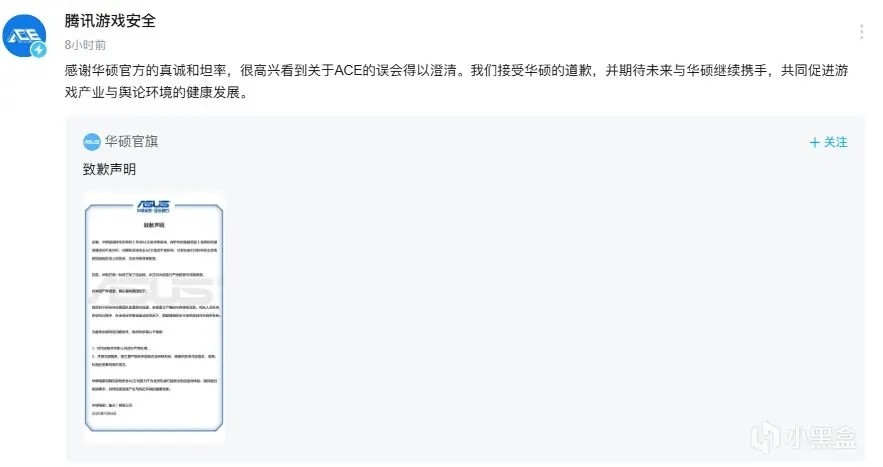 腾讯游戏安全ACE方面表示,感谢华硕官方的真诚和坦率,很高兴看到关于ACE的误会得以澄清。我们接受华硕的道歉,并期待未来与华硕继续携手,共同促进游戏产业与舆论环境的健康发展。