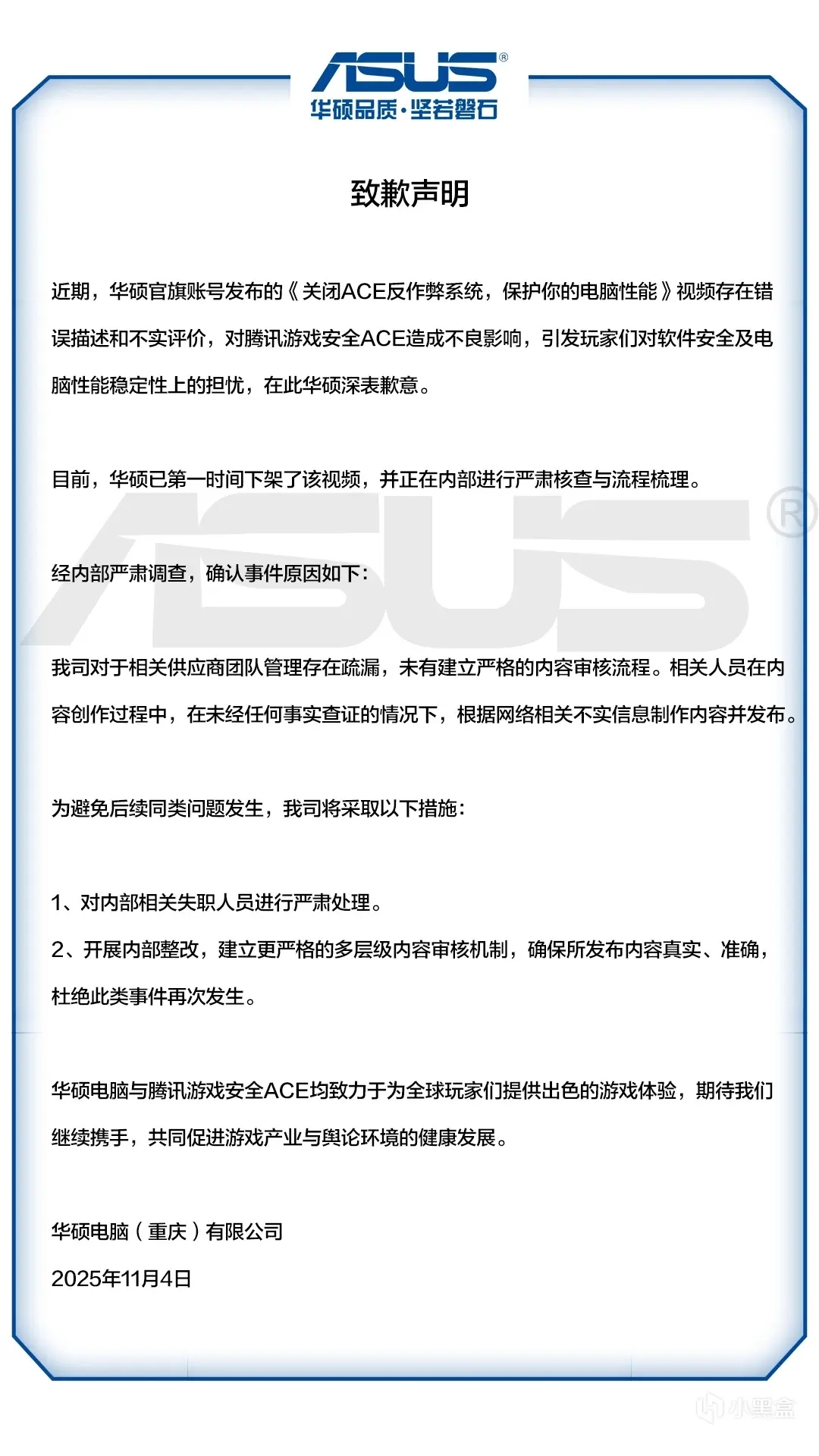 华硕方面表示:近期,华硕官旗账号发布的《关闭ACE反作弊系统,保护你的电脑性能》视频存在错误描述和不实评价,对腾讯游戏安全ACE造成不良影响,引发玩家们对软件安全及电脑性能稳定性上的担忧,在此华硕深表歉意。