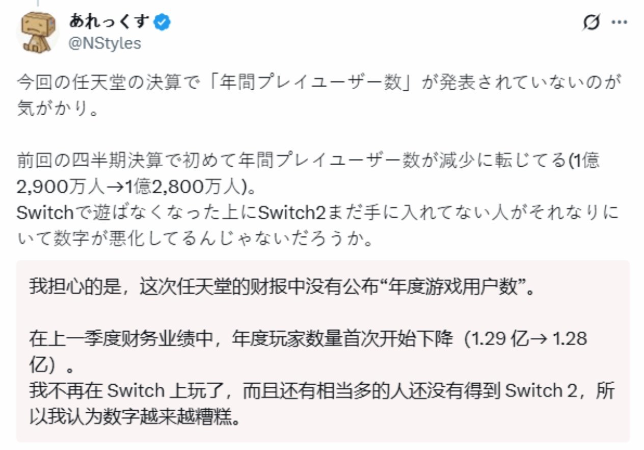 股东@NStyles在社交媒体上指出,在上次季度财报中,任天堂的年度游玩用户数从1.29亿人降至1.28亿人,出现了首次负增长。他担忧这次不公开数据,可能意味着用户流失趋势正在恶化。这一现象可能反映了部分玩家已逐渐停止游玩初代Switch,但尚未购入Switch 2,导致用户活跃度下降。尽管Switch 2开局表现强劲,但核心用户群的流失风险更值得警惕。