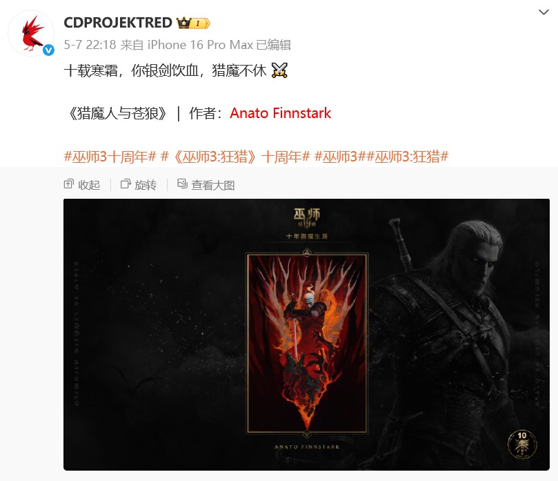曾和CDPROJEKTRED合作,绘制巫师3十周年 纪念插画《猎魔人与苍狼》。