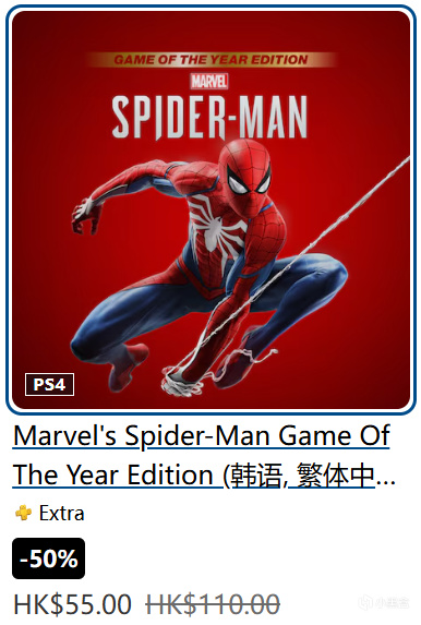 注意:该作位于二档库,蜘蛛侠1年度版ps4永降后新史低,非会员玩家更建议等待史低为244.24HKD的黑蜘蛛豪华版,会附赠ps5版的蜘蛛侠1年度版。【ps4版本锁定30帧,ps5可60帧,ps4光盘/数字可花费90HKD(折扣时为45HKD)升级为ps5年度版】