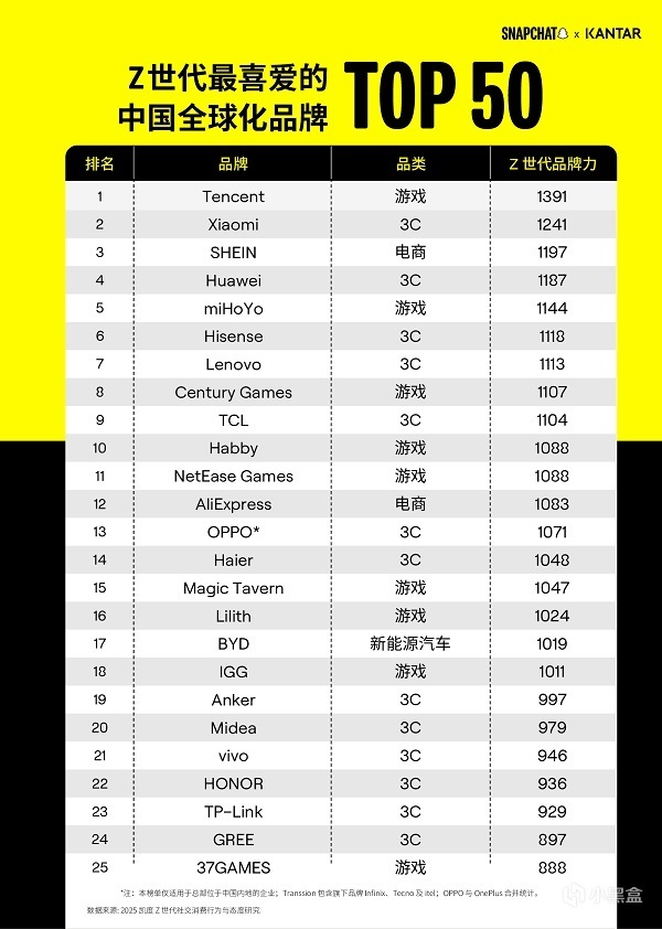 Snapchat 携手凯度(KANTAR)近期正式发布首个 “Z 世代最喜爱的中国全球化品牌 50 强” 榜单,游戏品类表现亮眼 —— 腾讯游戏以显著优势跻身榜单前三甲,与小米、SHEIN 共同领跑,9 家游戏品牌成功入围,其中 4 家跻身榜单前十,彰显中国游戏品牌在全球 Z 世代群体中的强劲影响力。