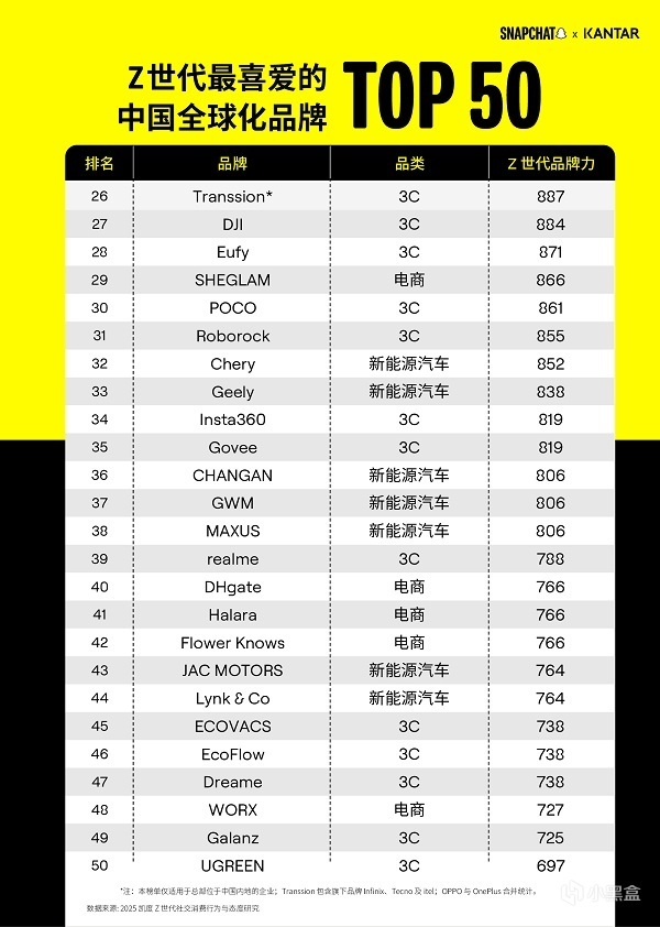 本次榜单覆盖 3C、游戏、电商、新能源汽车四大核心领域,共收录 50 家品牌。其中游戏品类占据 9 个席位,成为仅次于 3C 品牌(26 家)的第二大入围品类。在竞争激烈的头部阵营中,榜单前十品牌里游戏品牌占比达 40%,除腾讯游戏外,米哈游、点点互动等品牌也成功跻身前十,与 3C 品牌平分秋色,凸显全球 Z 世代对中国游戏品牌的高度认可。