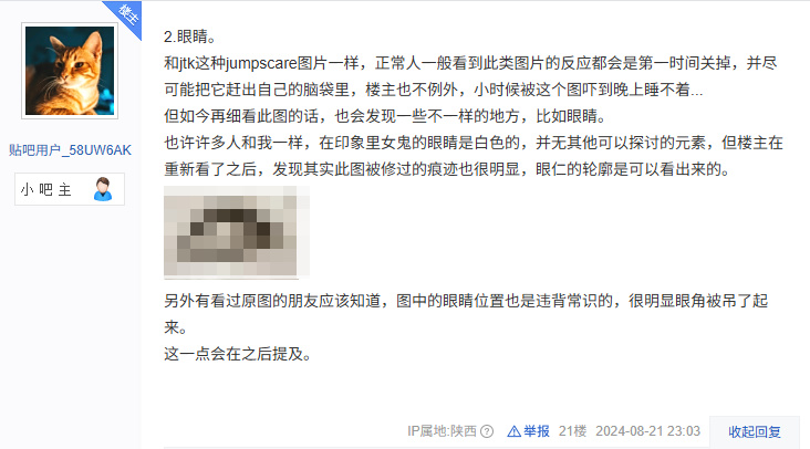 而後,接力棒傳到了百度貼吧都市傳說吧小吧主“貼吧用戶_58UW6AK”手中。2024年,他與B站UP主“comerpalomitas”一同展開對鬼圖本身的溯源,整個溯源過程相當細緻,無論是眼睛、眉毛特徵,還是修圖痕跡、側面若隱若現的人臉輪廓,各種細節線索都被考慮完全。