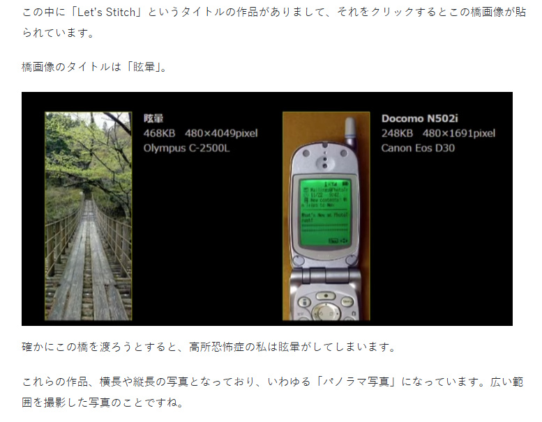 在Theつぶろ的視頻與文章中,最先探索出的便是吊橋圖片的來源。它來自一位日本攝影師的個人網站“Let’s Stitch!”,原名爲“眩暈”。而吊橋視角如此之長,正是因爲這位攝影師在網站上上傳了不少全景照片,其中便包括這座吊橋。