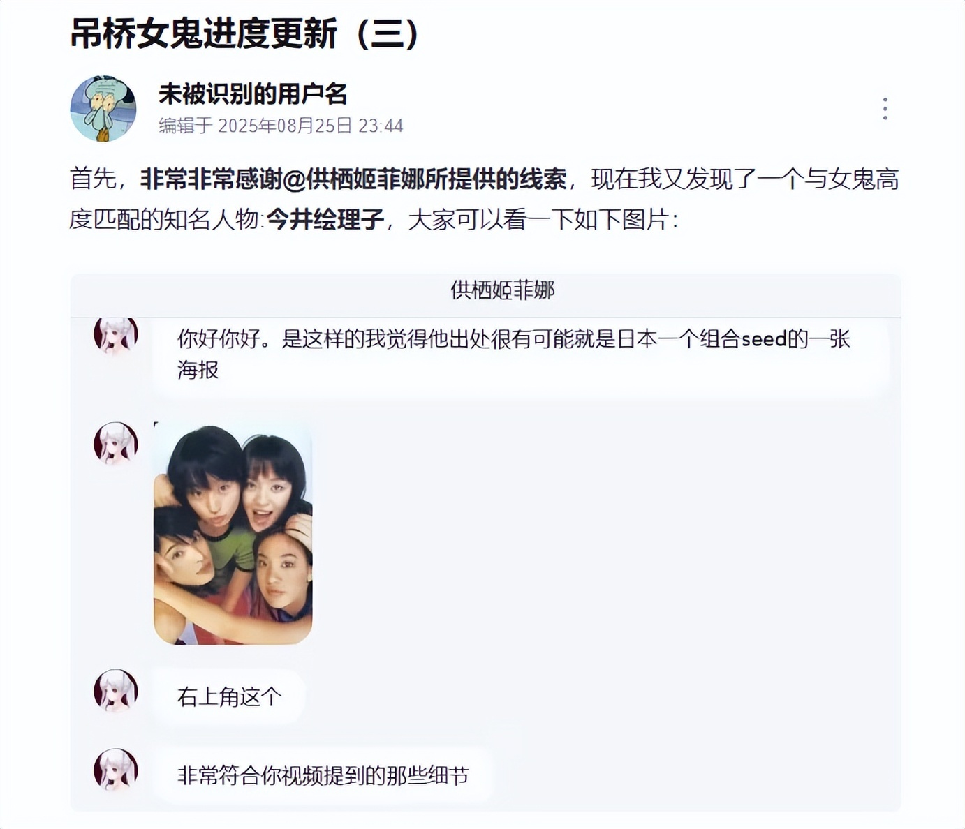 而在今年上半年,B站UP主“未被識別的用戶名”也開始進行女鬼圖片調查。他順着女鬼圖片的線索,利用網站快照一路搜索多個鬼圖網站,並繼續盯着大把鬼圖進行研究,嘗試通過這條路徑來尋找原圖。與此同時,也有不少網友爲其提供線索,以此來縮小搜尋範圍——如果真的是名人,那很有可能取自某個組合的海報或合照;如果是個人隨手照片,那便極有可能杳無音信。
