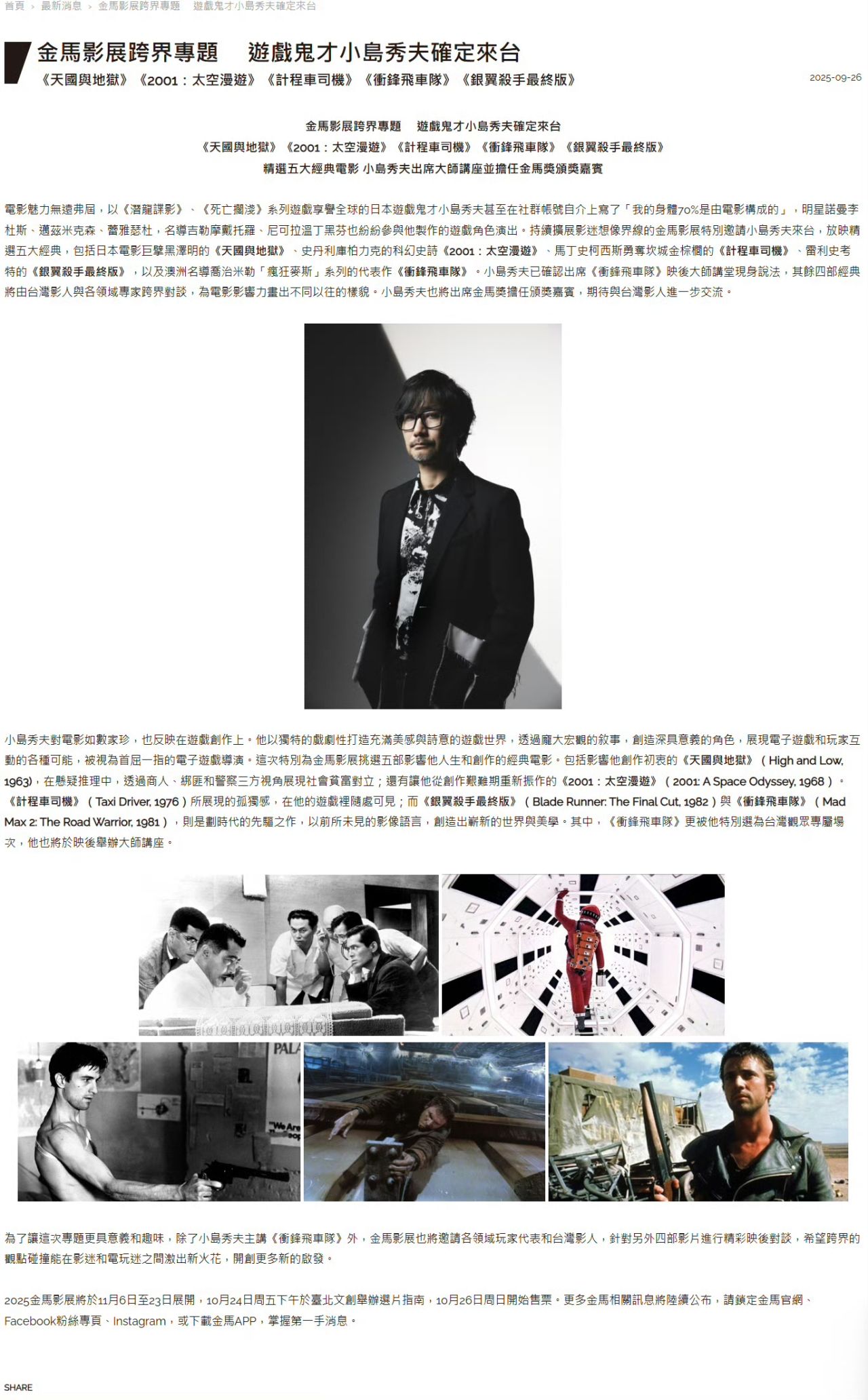 小岛秀夫将参加于11月6日至23日期间举办的「2025中国台北金马影展」,出席大师讲座并担任金马奖颁奖嘉宾。