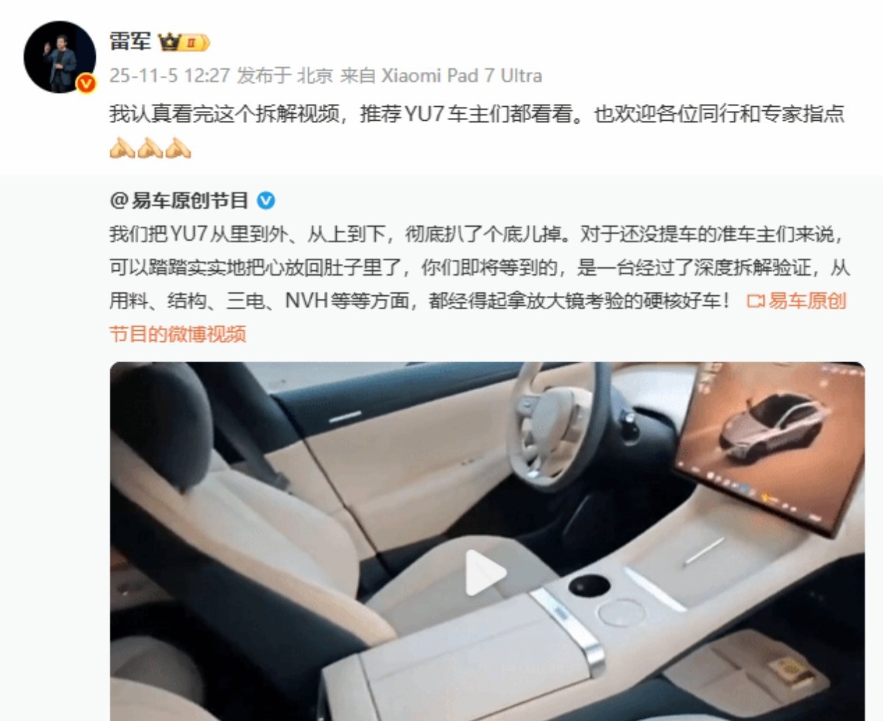 11月5日,易車原創節目發佈小米YU7全網首拆視頻,將車輛從車身結構到電池系統進行了徹底解析。小米CEO雷軍隨即在社交媒體回應:“我認真看完這個拆解視頻,推薦YU7車主們都看看。也歡迎各位同行和專家指點。”