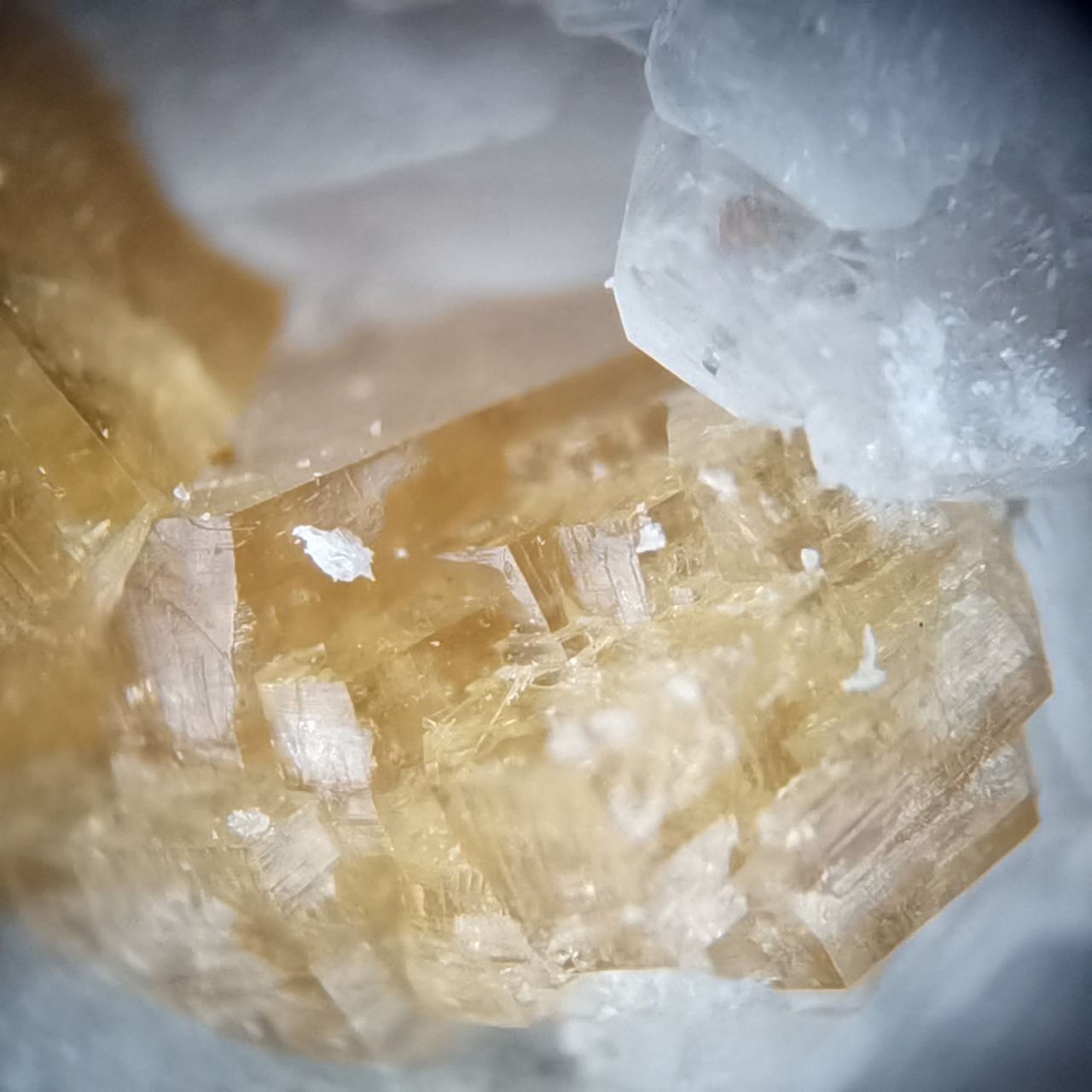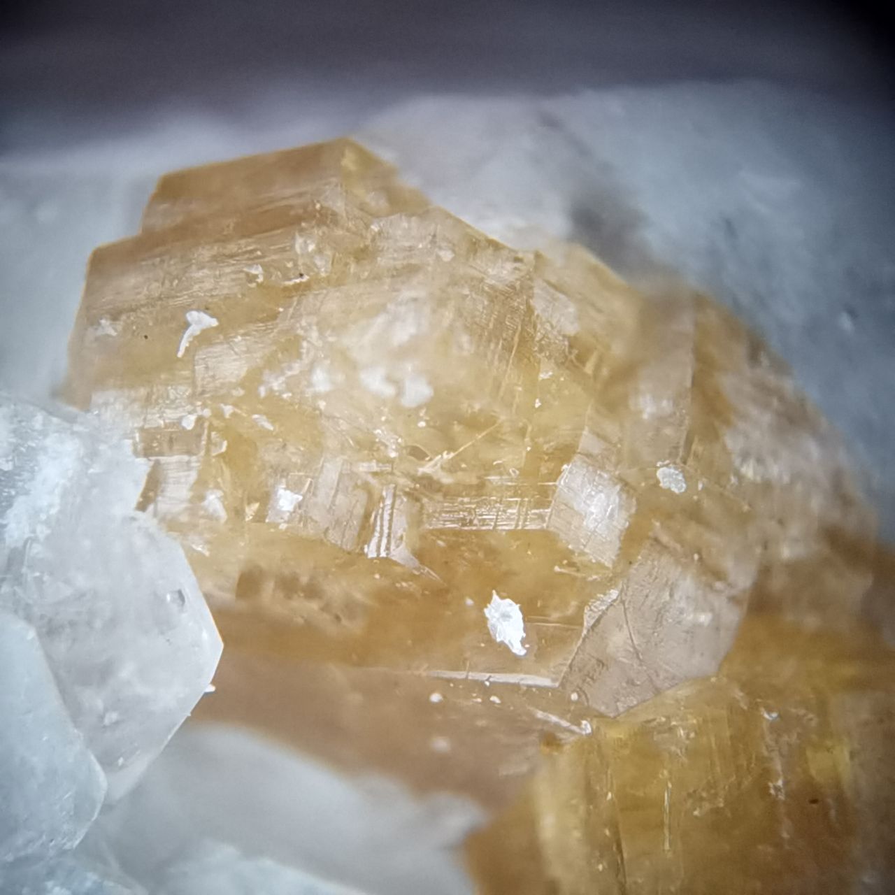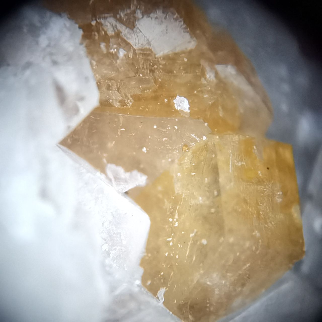 本块标本的氟碳钙铈矿隐藏在方解石中,颜色蜜黄,呈现六棱柱向两侧锥状生长的趋势,中间有一条若隐若现的分带。方解石在同一块底岩上呈现菱面体和奔驰头两种不同的形态,非常奇特,虽然没有荧光,但通体透明,包裹体很少,而且两种形态并没有交错生长,而是各自泾渭分明,从未在别的方解石上见过。