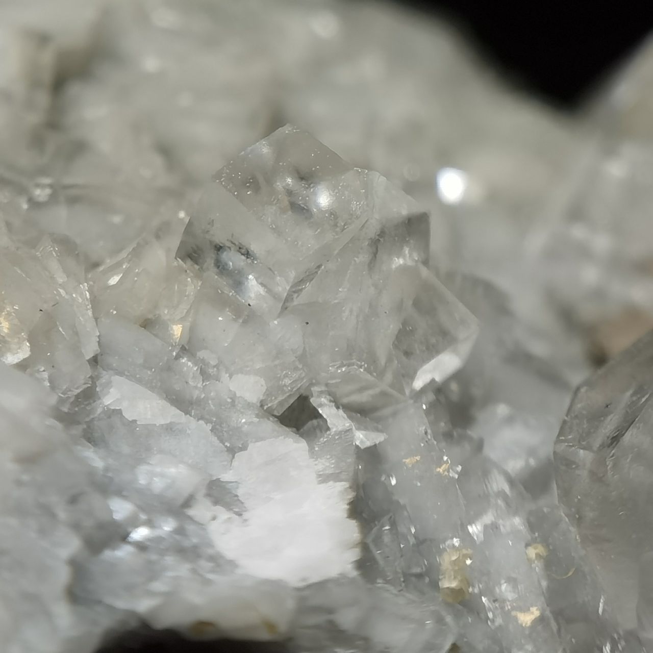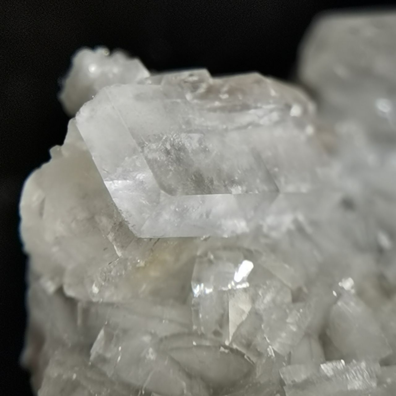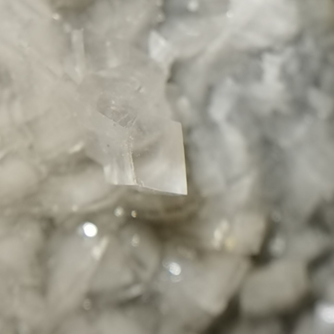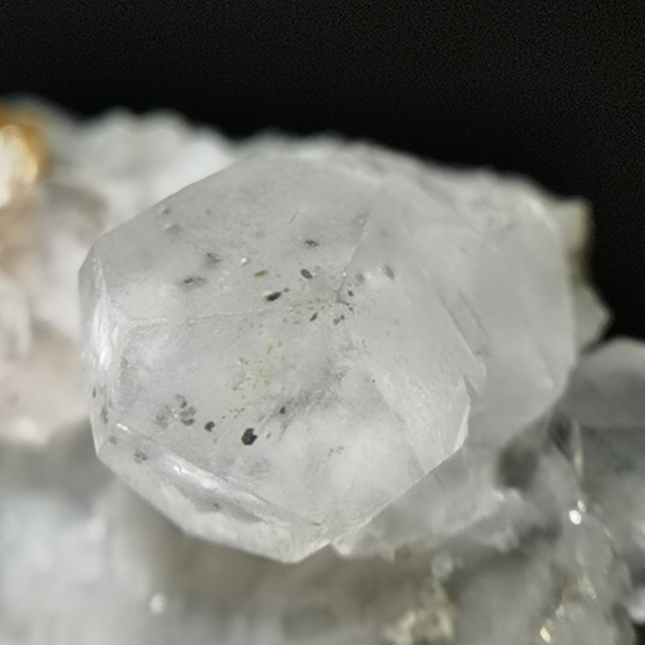 本块标本的氟碳钙铈矿隐藏在方解石中,颜色蜜黄,呈现六棱柱向两侧锥状生长的趋势,中间有一条若隐若现的分带。方解石在同一块底岩上呈现菱面体和奔驰头两种不同的形态,非常奇特,虽然没有荧光,但通体透明,包裹体很少,而且两种形态并没有交错生长,而是各自泾渭分明,从未在别的方解石上见过。