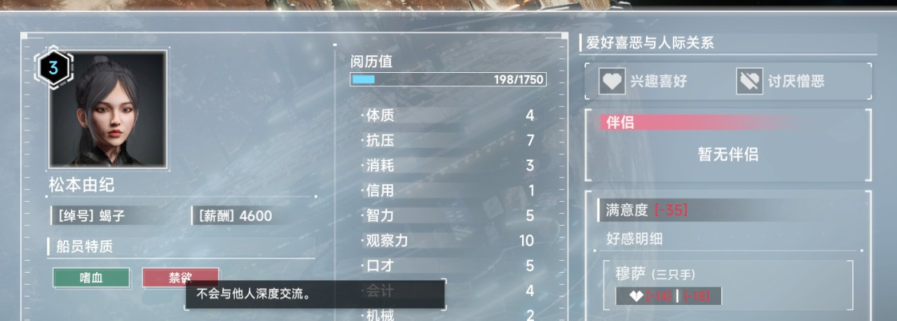 招募到一名禁欲特质的船员,特别好奇最后能不能强人所难,结为伴侣。船员岗位只有驾驶员,希望正式版能加入战斗员、维修员和后勤官等职位,实现全自动化跑商。