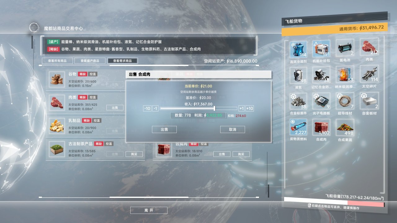 对齐不同太空站的产出和需求,多点连接成一条完整的商业路线,不走回头路才能实现跑商效率最大化。除了自己倒卖商品外,还可以顺路承接NPC的货运委托。每个城市的政务中心会发布专项的商品补贴。