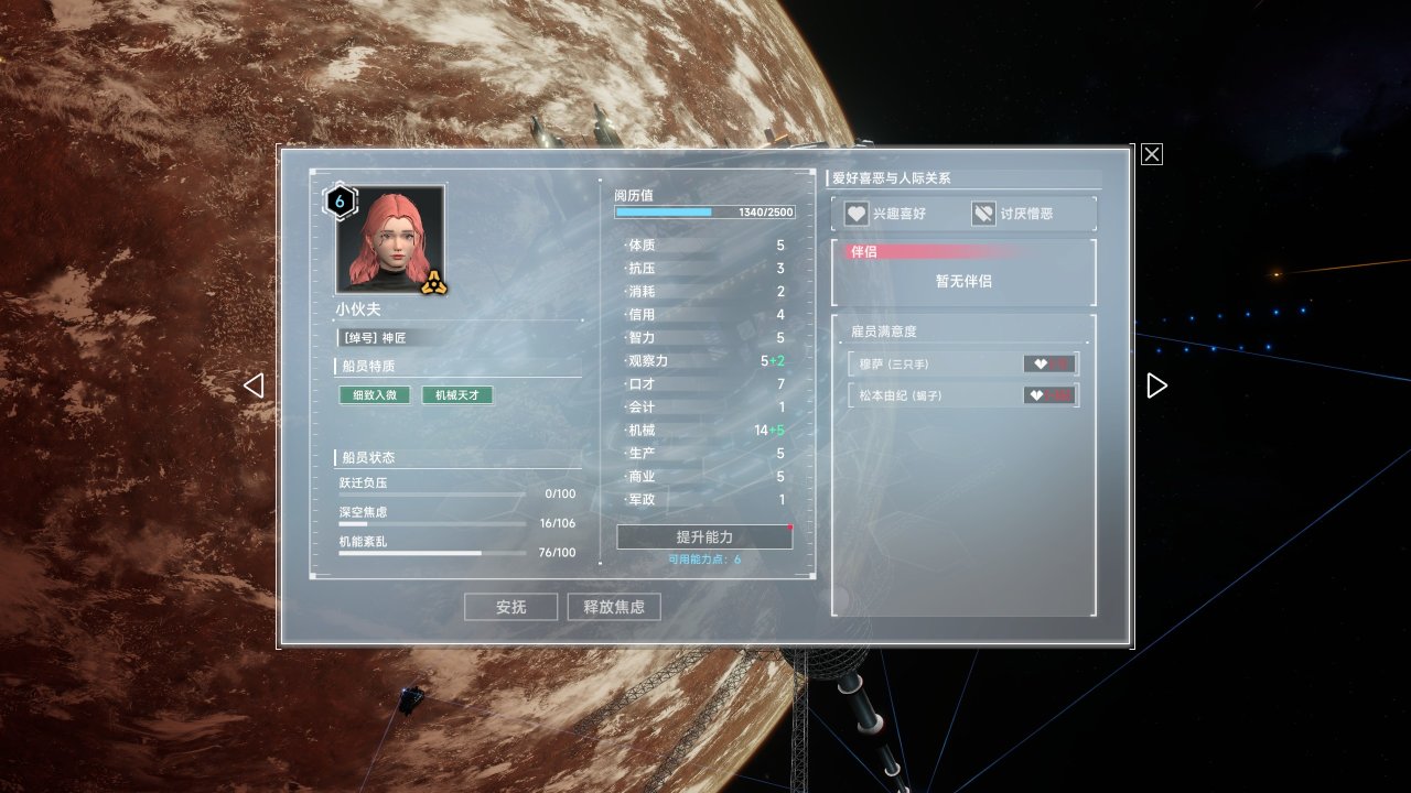 口才、观察力、会计、机械和商业等不同属性,会影响采购、谈判和维修等操作效率。游戏有恋爱伴侣系统,星际姻缘一线牵。