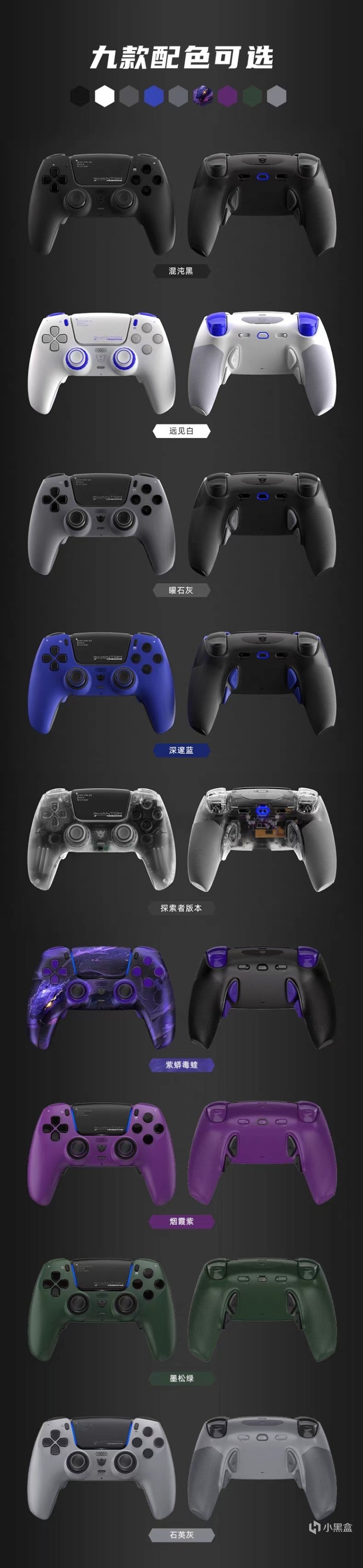 手柄的配色可以说是非常的丰富,并且各种配色价格都一样,不需要在外观和价格上做纠结了,其中手柄有些配色非常独特,例如透明版的探索版和印有紫蟒的紫色毒蝰版,大大扩充了玩家的选择。