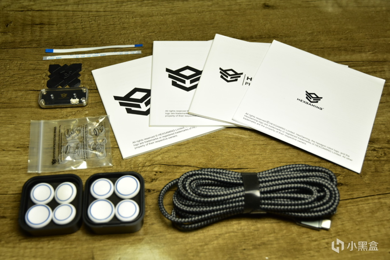 另外还有8个共五种替换摇杆,用于调节摇杆的工具,套在摇杆外壁的防磨圈,以及说明书和数据线,数据线为编织线,线材长度也很长,还是很有诚意的。