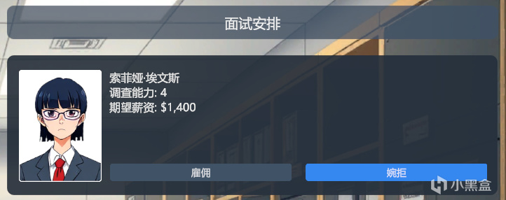我点了之后,来了个看起来像是实习学生妹的人,调查能力只有4,提出的薪资要求倒不是很高,$1400大概相当于¥10000,我们礼貌的婉拒,继续点招人按钮招人。
