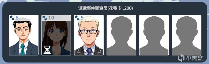 我们可以看到人物照片上方有一个小的杠铃图标和数值,这是该员工的工作能力值。能力值越高的,调查花费的时间越少。已经派出去的员工,会显示沙漏,头像暗掉了,这个最强能力者,我们不能选,只能从旁边两个废柴里面选择一个更废的去干这事,花的时间有点长但还是能干好的。