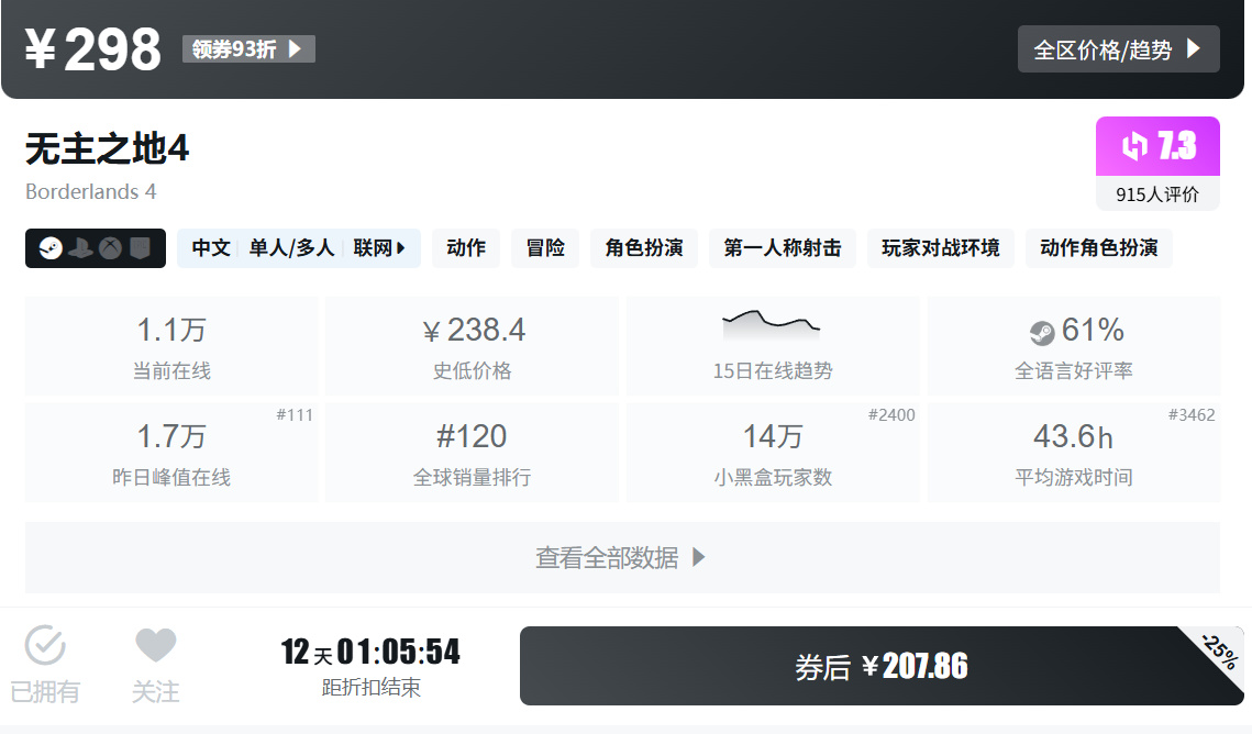此次折扣是小黑盒上的(75折超史低),Steam上暫未有折扣,還可以疊加93折優惠券+盒幣抵消更低價拿下。