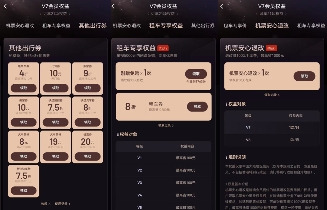 包括現在滴滴也在自己做機票,所以給了一項機票安心退改的權益,每月一次,退改免手續費。