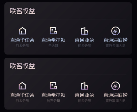 除了機場休息室跟高鐵貴賓廳之外,最關鍵的是,跟華住會、希爾頓、亞朵打通了,這三個目前算是國內最頂的商旅酒店體系。