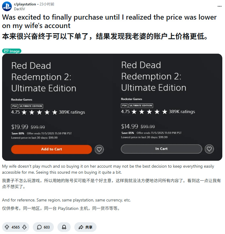 相關討論源於Reddit平臺r/playstation版塊用戶發帖揭露同一家庭兩個PS賬戶中《荒野大鏢客2:終極版》的定價差異。用戶名爲DarXIV的發帖者表示,雖"對終於購入感到興奮",但發現妻子賬戶價格更低後興致驟減:"妻子不常玩遊戲,用她賬戶購買會導致我難以便捷訪問。這個發現極大挫傷購買意願。"