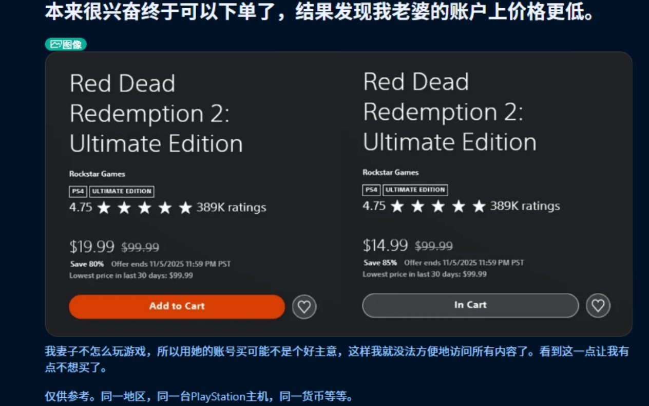 近日,一位Reddit玩家發帖稱,他在同一臺PS5上切換自己和妻子的賬號後,發現PlayStation商店對同一款遊戲《荒野大鏢客2:終極版》給出了不同的折扣力度。該玩家賬號顯示折扣爲80%,而其不常玩遊戲的妻子賬號卻享受85%折扣。