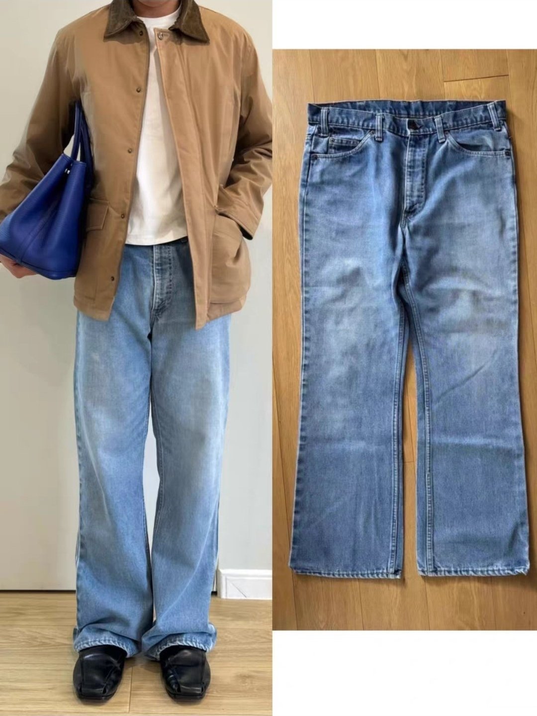 像这套很日常的阿美咔叽风,可以借鉴他的搭配寻找平替:蓝色条纹衬衫搭配深蓝色领带,外边套上棕色灯芯绒外套,下身原色牛仔裤,棕色的鞋子与外套相呼应。也可以借鉴他的色彩搭配:蓝色/棕色,配饰它使用了帽子和眼镜增添氛围。