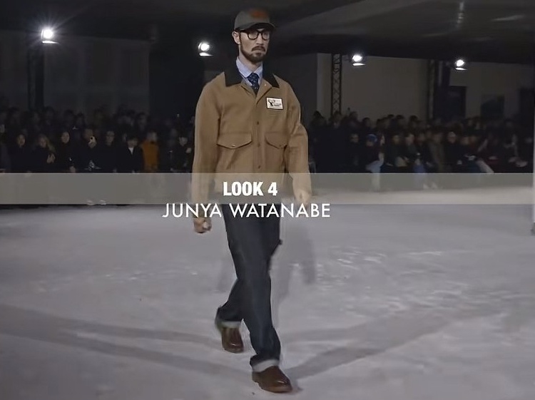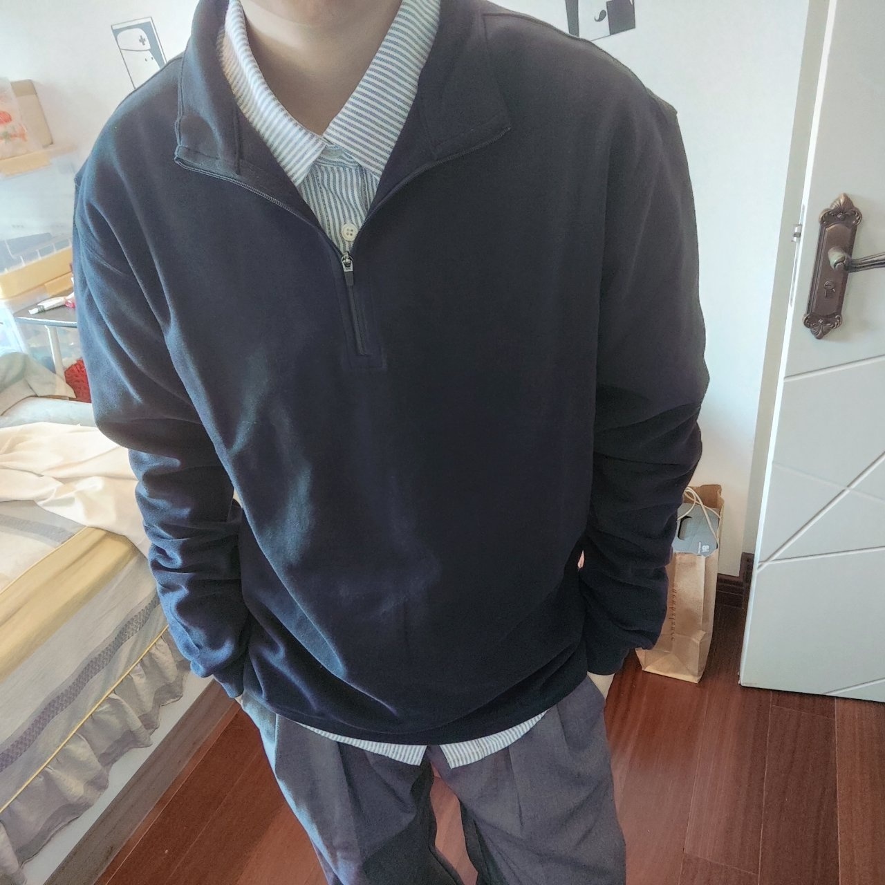 这套秀场搭配我非常喜欢他上衣领口部分的叠穿效果,所以我借鉴他的思路,没有格子衬衫就换成条纹衬衫平替,没有深蓝POLO衫就换成有立领黑蓝卫衣平替,效果也是蛮好的。