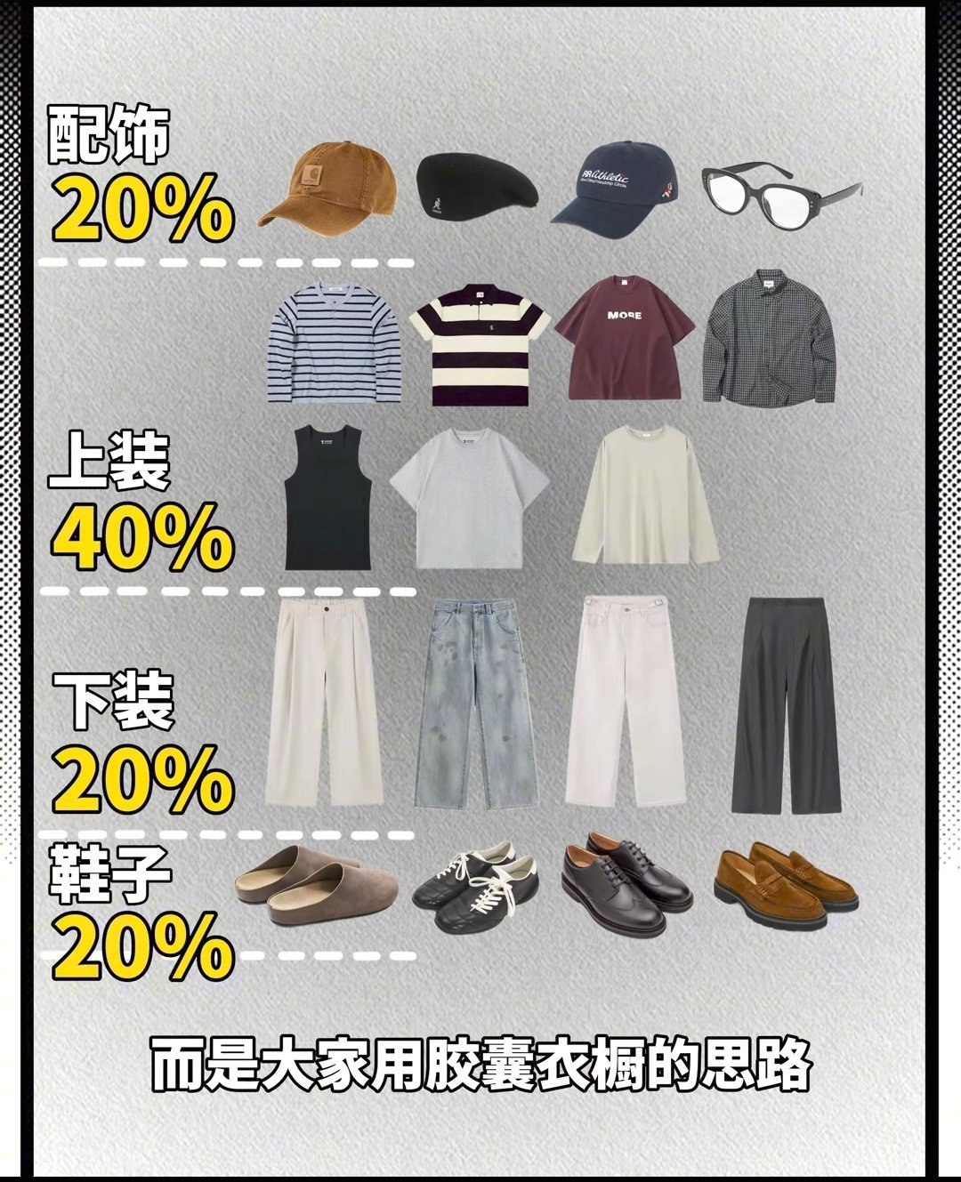 核心是用少量、高品质、易互搭的单品,组合出最多的穿搭组合。