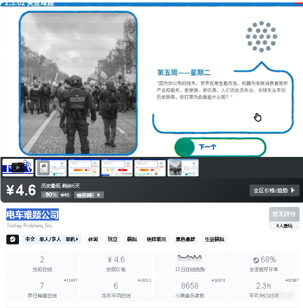 电车难题公司》是一款基于真实哲学论文的黑色幽默叙事游戏。游戏中,你需要从可怕的两难选项中做出一系列不可能的选择。接受良心的拷问,决定数百万人的命运——你还可以将自己的选择与其他人进行比较。