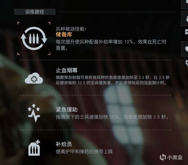 禁区冲突和大战场一样走的四个职业划分,职业没有终极技能,不过在右边有个经验制的进度条,翻箱子、做任务捡破烂都会增加经验,达到一定范畴后可以解锁新的被动(像是医疗包的可以带更多弹药+护甲板、以及快速拉人都很好用)