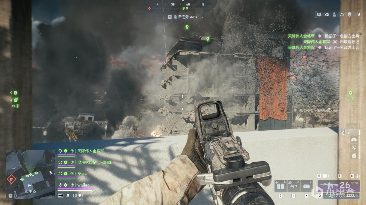 本作也有轰炸的道具,不过相比于战区的获取难度更简单,通常开箱子+做任务就能随手获得,打到后面经常会出现队伍里人手一个“空袭”的情况,也会发生三个队伍的空袭覆盖了整片小地图,搭配上各种燃烧弹投掷物整个区域呈地狱景象,从特效来说真的是看到了战场的混沌感,同时楼层破坏机制也能用完美解决部分玩家占领高低形成无脑高打低的问题。