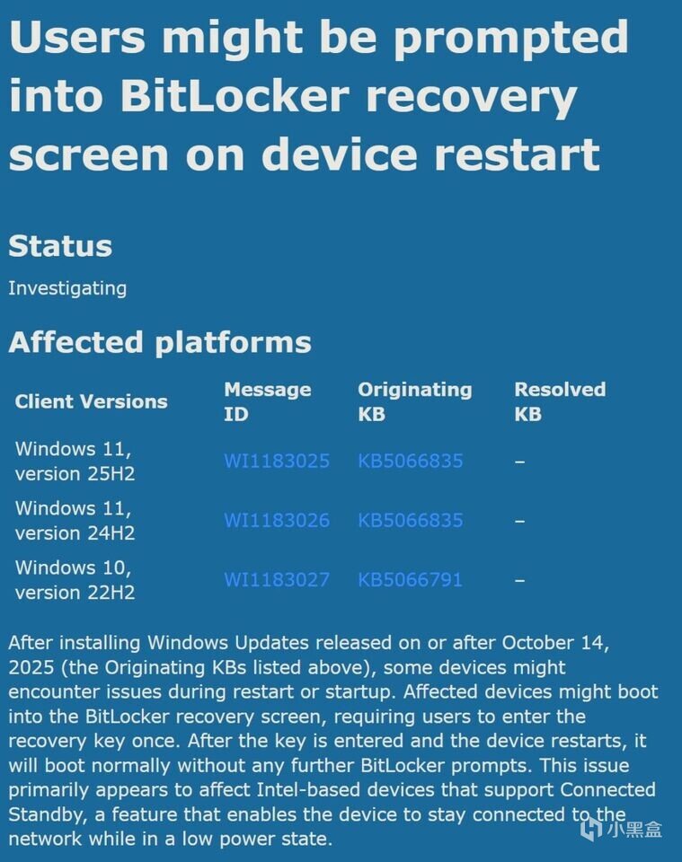 微软又遇到了一个异常问题,这次主要影响基于英特尔处理器的电脑。Windows 11 25H2 和 24H2 的用户,以及部分 Windows 10 用户,可能会意外地进入 BitLocker 恢复模式,需要输入密钥才能解锁。