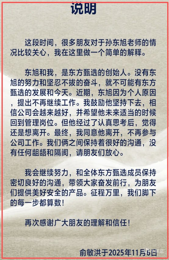11 月 6 日,俞敏洪在社交媒体发文确认,东方甄选联合创始人孙东旭因个人原因正式离职,不再参与公司任何工作。这一消息让这位陪伴新东方走过 17 年的核心高管再次走进公众视野,而他此前两天套现 2 亿港元的操作也被重新提及。