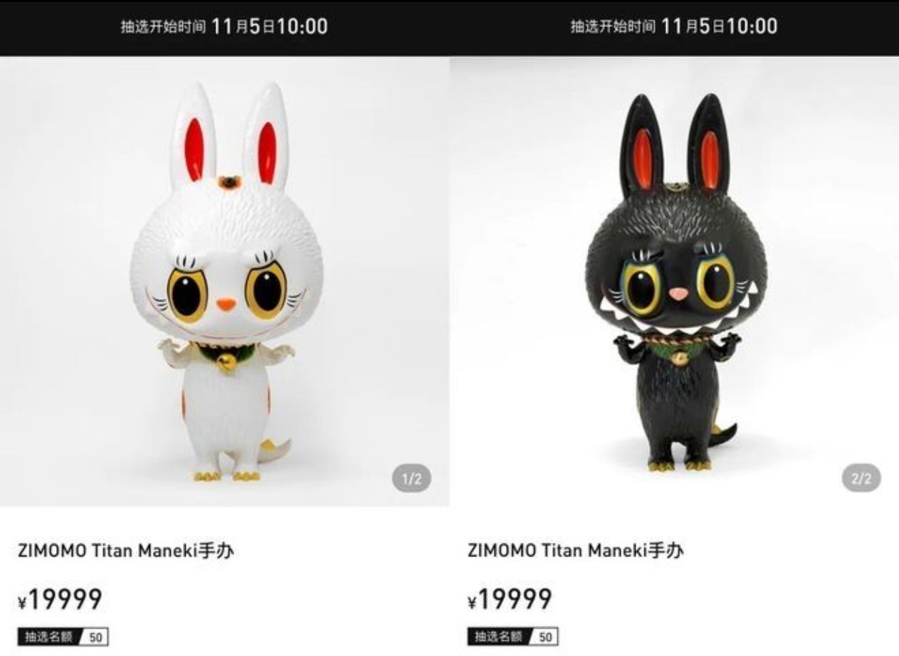 11月5日,爲慶祝Labubu The Monsters十週年,泡泡瑪特推出限量版ZIMOMO Titan Maneki手辦,發售價19999元。這款手辦限量50個,高約70cm,有黑白兩種配色,其中黑色隱藏款僅3個,抽中概率爲6%。