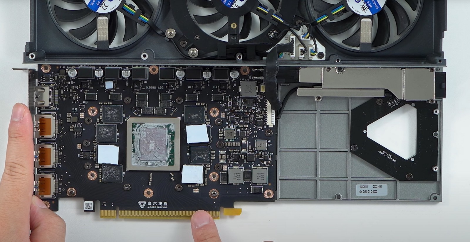 该博主首先放出了多张拆解实拍图,可以看到三风扇、四热管、散热鳍片的内部结构设计,以及PCB电路板、GPU芯片、供电电路和各种元器件。