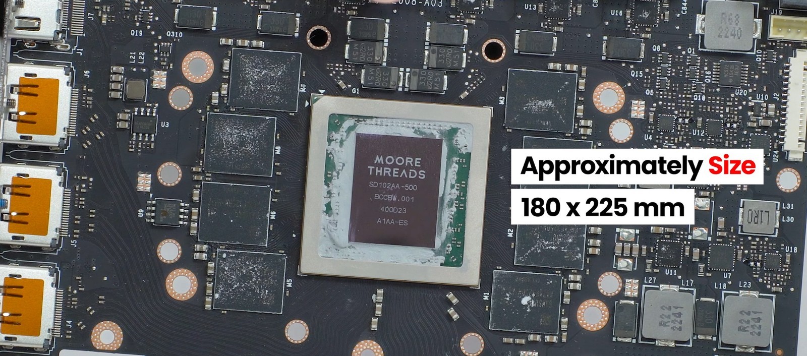 GPU芯片面积粗略测量为22.5x18.0毫米,也就是405平方毫米,还是比较大的,但晶体管数量无从知晓。作为参考,NVIDIA AD103核心(RTX 4080)的面积为378.6平方毫米,集成459亿个晶体管、9728个CUDA核心。