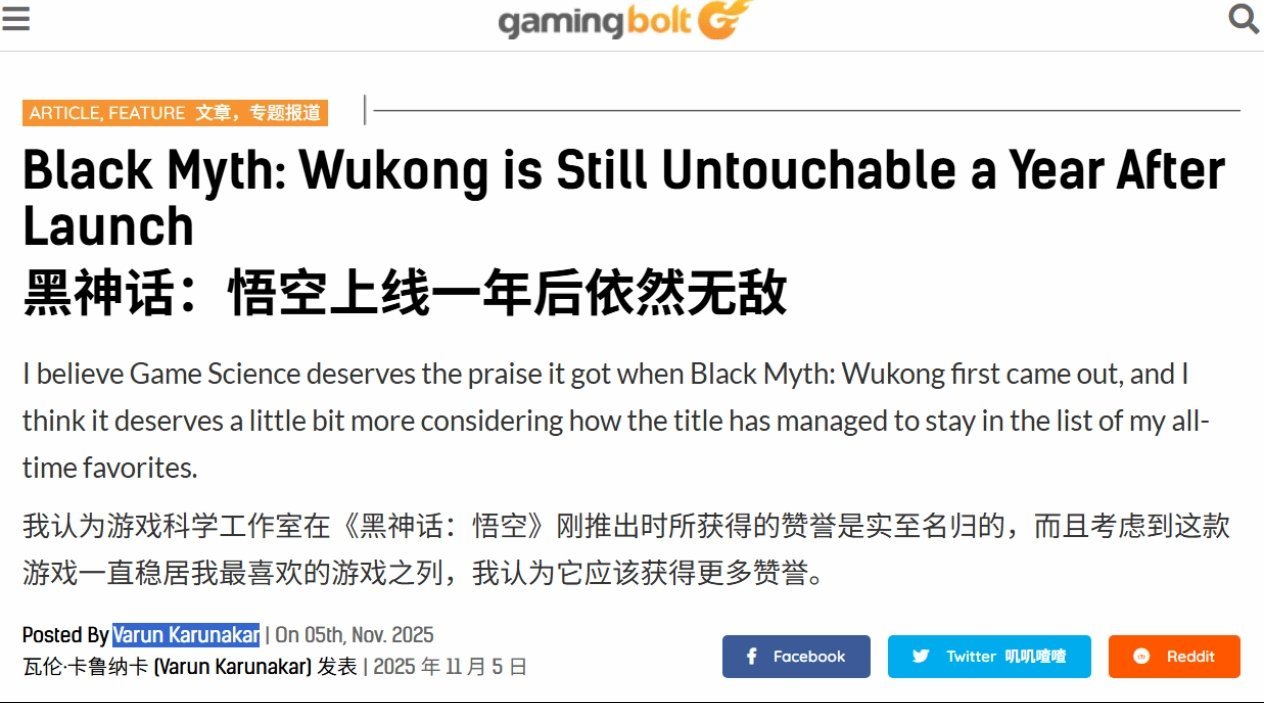 近日,外媒GamingBolt發佈專題文章,盛讚《黑神話:悟空》在發售滿一週年後,依然在動作冒險品類中保持領先地位。該媒體編輯Varun Karunakar評價稱,遊戲科學的這款作品在執行力與呈現力上已能與經典作品《只狼》相提並論。