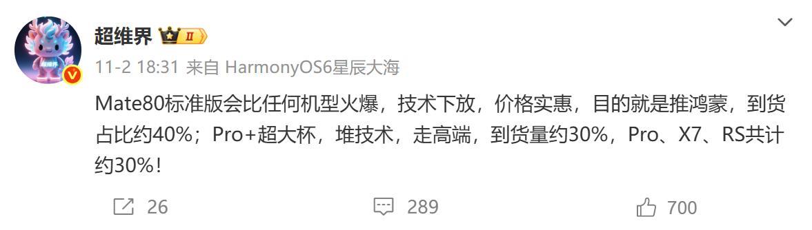 华为mate80系列铁定本月发布,但具体的日期还需等待官宣。作为年度旗舰,mate80系列将集中展示近一年以来华为在手机方面的创新,整体的关注度非常高。近日有博主曝光了mate80系列的备货情况,标准版占比约为40%,Pro+版本约占30%,其他机型占比约为30%。从备货情况我们可以看出,华为mate80系列无疑将主推标准版。