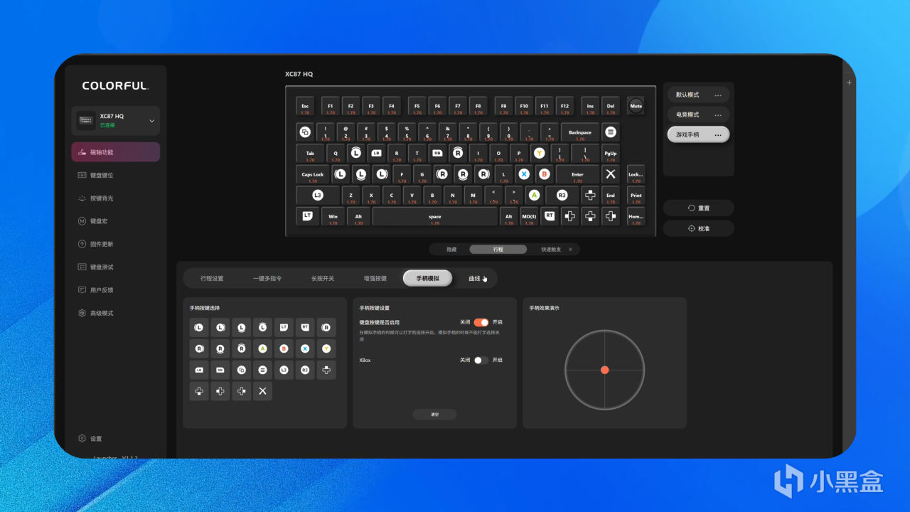 网页驱动本身的页面UI设计跟交互体验就已经很棒了,除了基础的键盘参数调整,轴体设置跟高级按键功能以外,是我除了雷蛇之前第一个看到有搭载手柄模式的磁轴键盘。