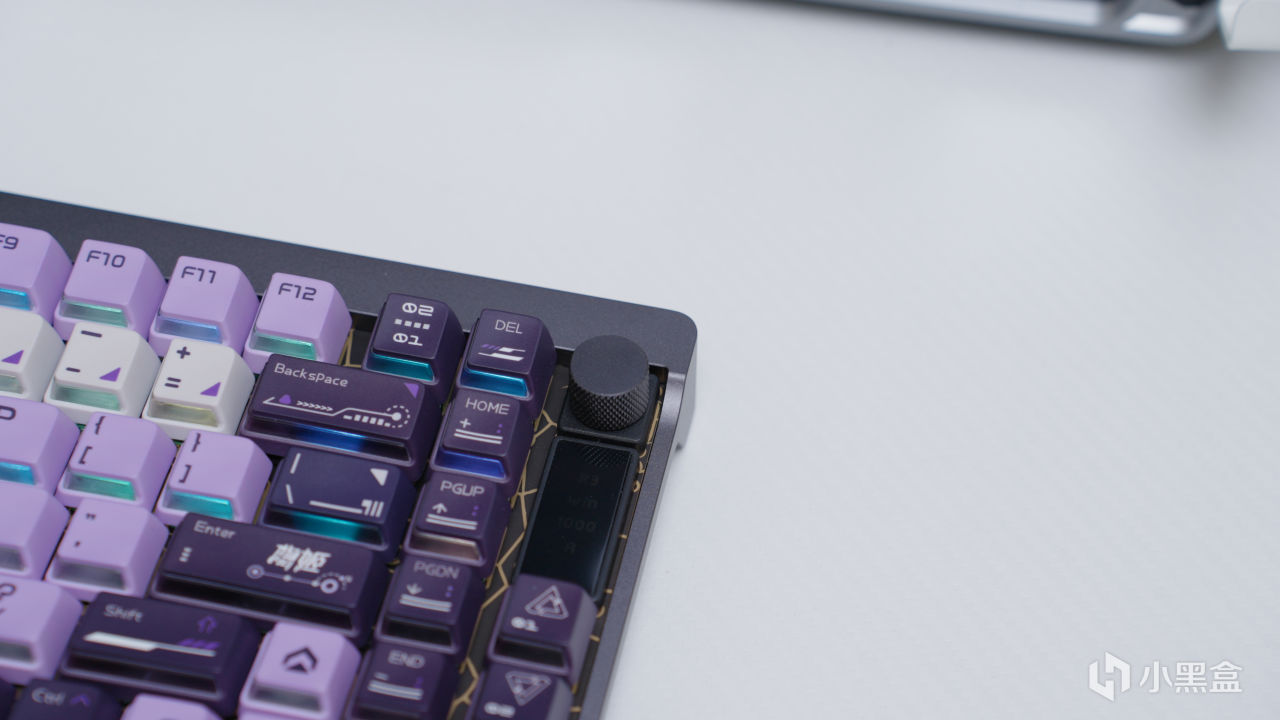 右上角集成了金属旋钮+OLED屏幕,可以调节音量,查看目前键盘的配置信息,回报率,可视化调参还是蛮方便的。
