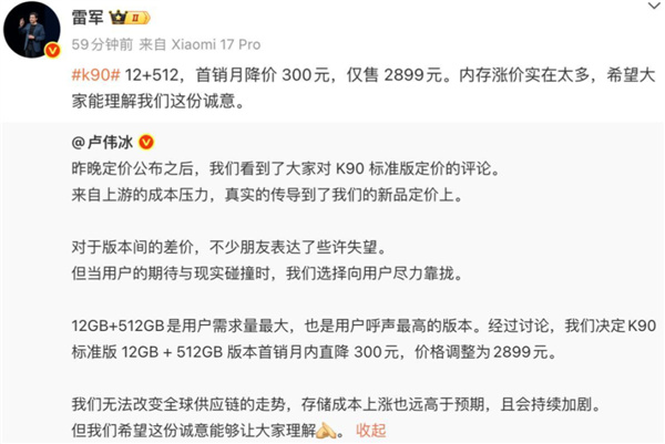 這不,前幾天,雷軍也在微博上回應紅米K90定價太高,原因就是因爲“內存漲價實在太多”。