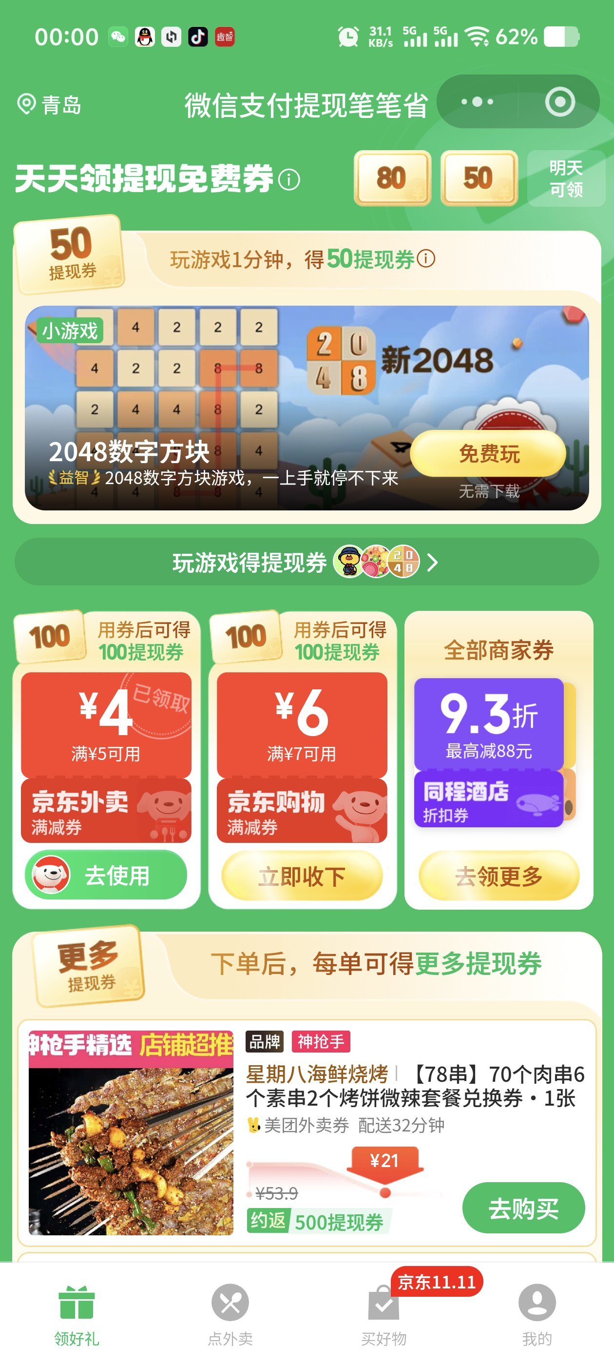 游戏额外得券:参与小程序内的2048等小游戏,玩1分钟就能再得50元提现券。