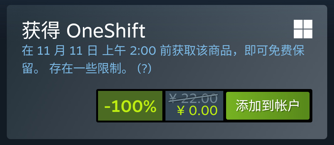 ①打开steam,搜索游戏的名字「OneShift」,点击添加至账户即可
