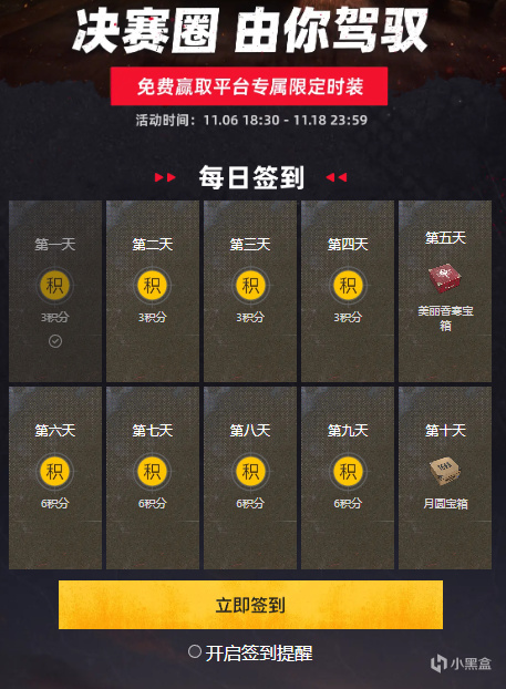 • 每日簽到:連續簽到10天,累計可得36積分 + 2個限定寶箱(第五天美麗香寒寶箱、第十天月圓寶箱)