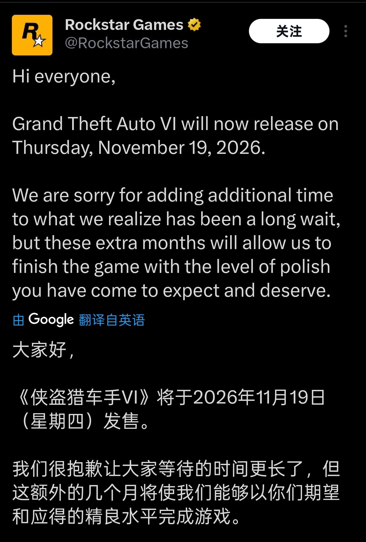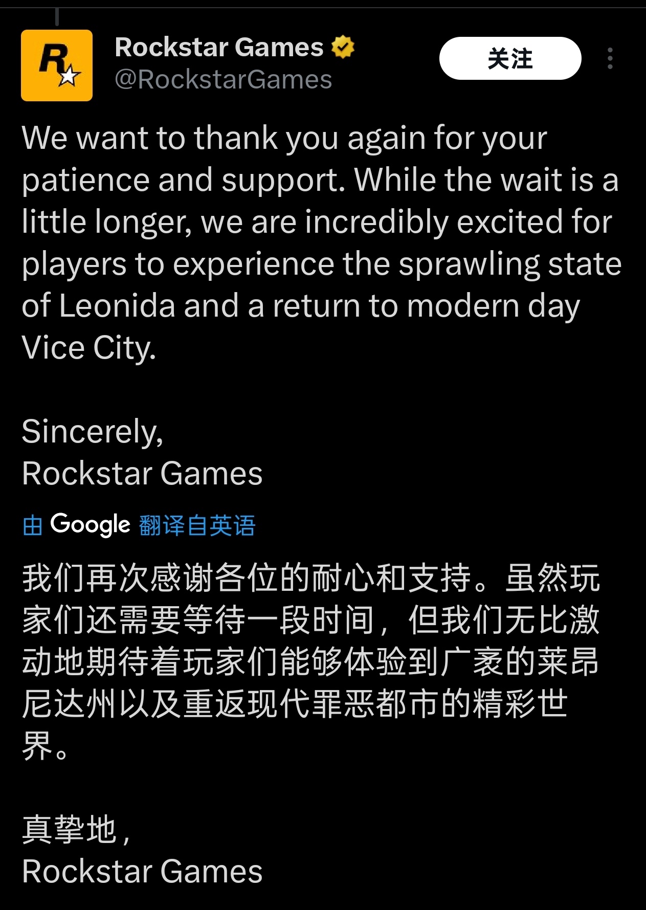 再次感謝大家的耐心與支持。儘管等待將稍作延長,但我們由衷期待玩家們踏入廣闊的萊奧尼達州,重返現代背景下的罪惡之城(Vice City)。