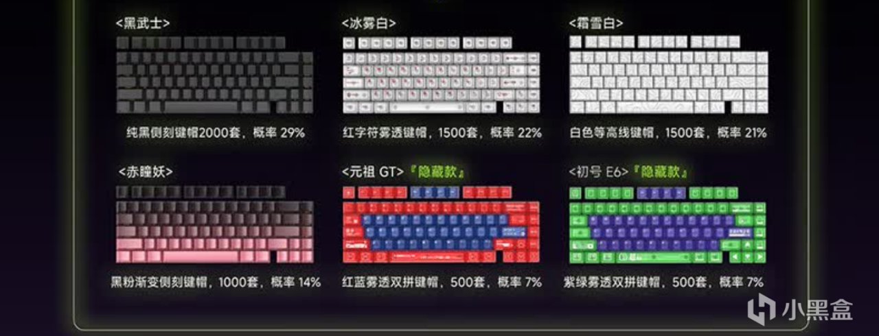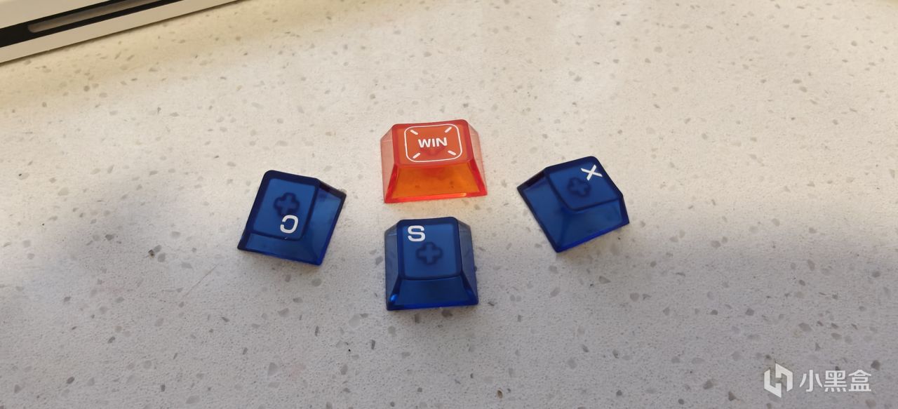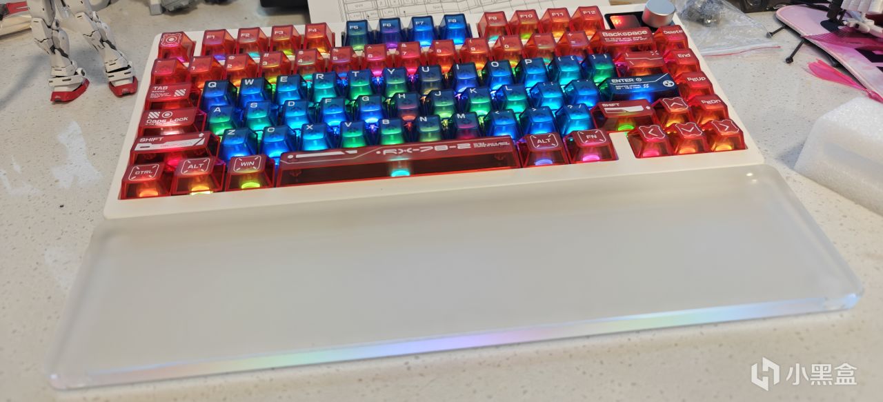 然后就要说一说这次的赠品了。首先是键帽盲盒,我觉得是十分实用的。众所周知,游戏打不好的时候可以更换外设,调节心情,而我们更换键帽,从另一种意义上来说,也算是更换键盘了。还有赠送的亚克力手托,一方面可以在支撑手臂,另一方面就是搭配侧面的RGB效果,颜值进一步提升。