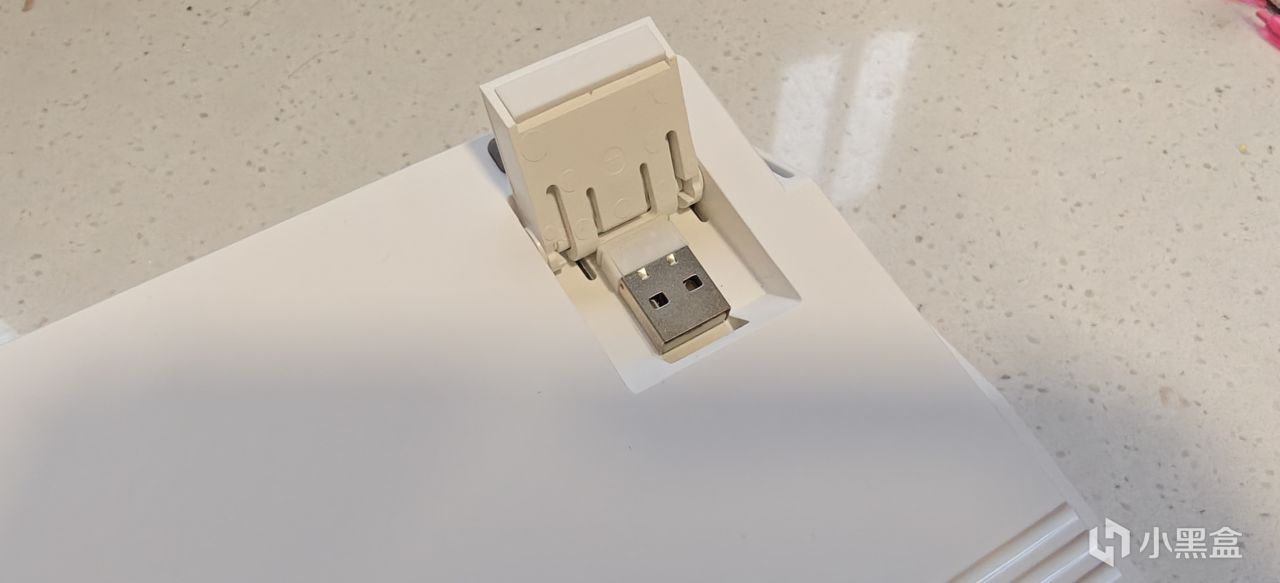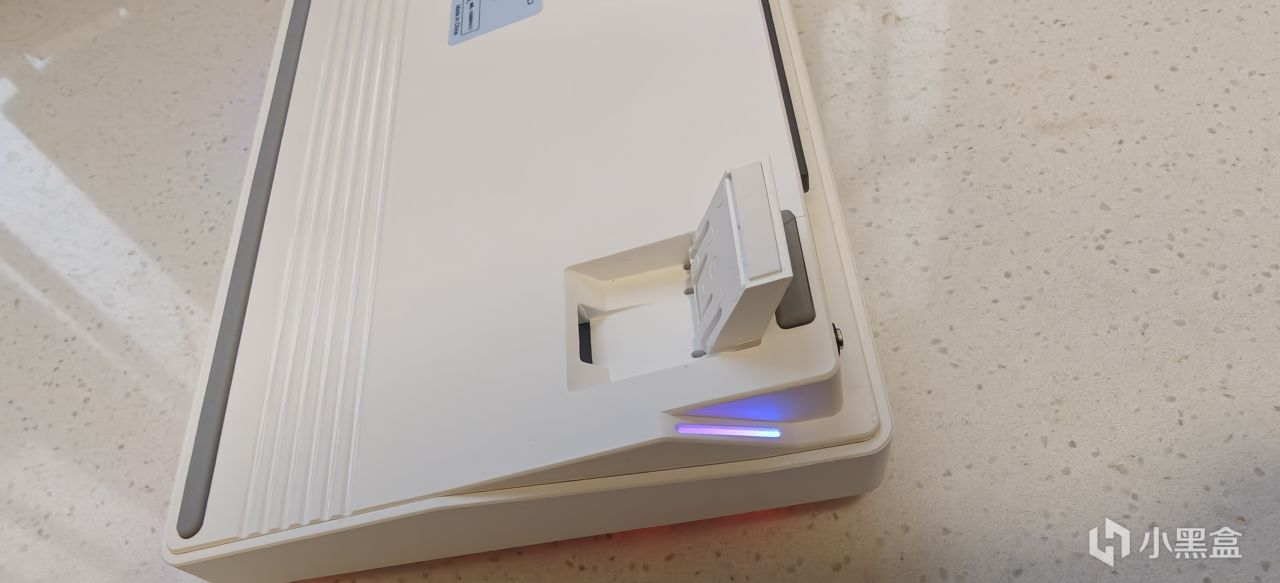 反转键盘,来到背面。亮眼的就是下方一整条的硅胶防滑垫,上面两条硅胶垫如同眉毛一样?而两颗眼睛就是两段式支撑。其中2.4G连接接收器就是藏在右边的两段式支撑里面,而且还是磁吸设计。即使在脚撑打开的状态了,用力晃动接收器也不会掉落。